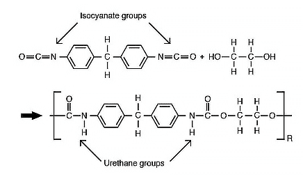 Polyurethane polymers are made by combining isocyanates (R-N=C=O) with polyols containing hydroxyl (- OH) functional groups. The reaction forms urethane linkages as seen below.